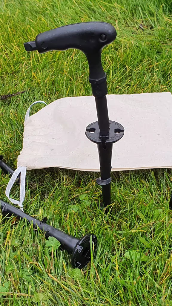 The head of these tough, heavy duty earth screws (Made in New Zealand Tent Pegs) are designed for a 4mm guy rope to be easily clipped into place for a secure fastening. They can be easily removed without heavy pulling and, when required, the peg can be left permanently in place as they won't corrode like steel tent pegs. The guy rope is set closer to the pole or side of tent thus reducing any trip hazard. These heavy duty screw in pegs are designed to be easy to use, screw in and has less ground disturbance on withdrawal. Wind resistance is 35kg making it a stronger anchoring peg than the equivalent ‘knock in’ peg. Tote bags, also made in NZ are available, each tote bag can hold up to six screw in pegs and a NZ made hand tool to make a tent peg set. Tote bags work with a drawstring and are lightweight unlike leather tote bags.